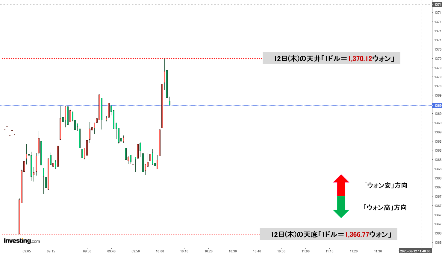 2025年06月12日(木)の市場が開きました。10:00現在、ドルウォンのチャートは以下のようになっています(チャートは『Investing.com』より引用)。