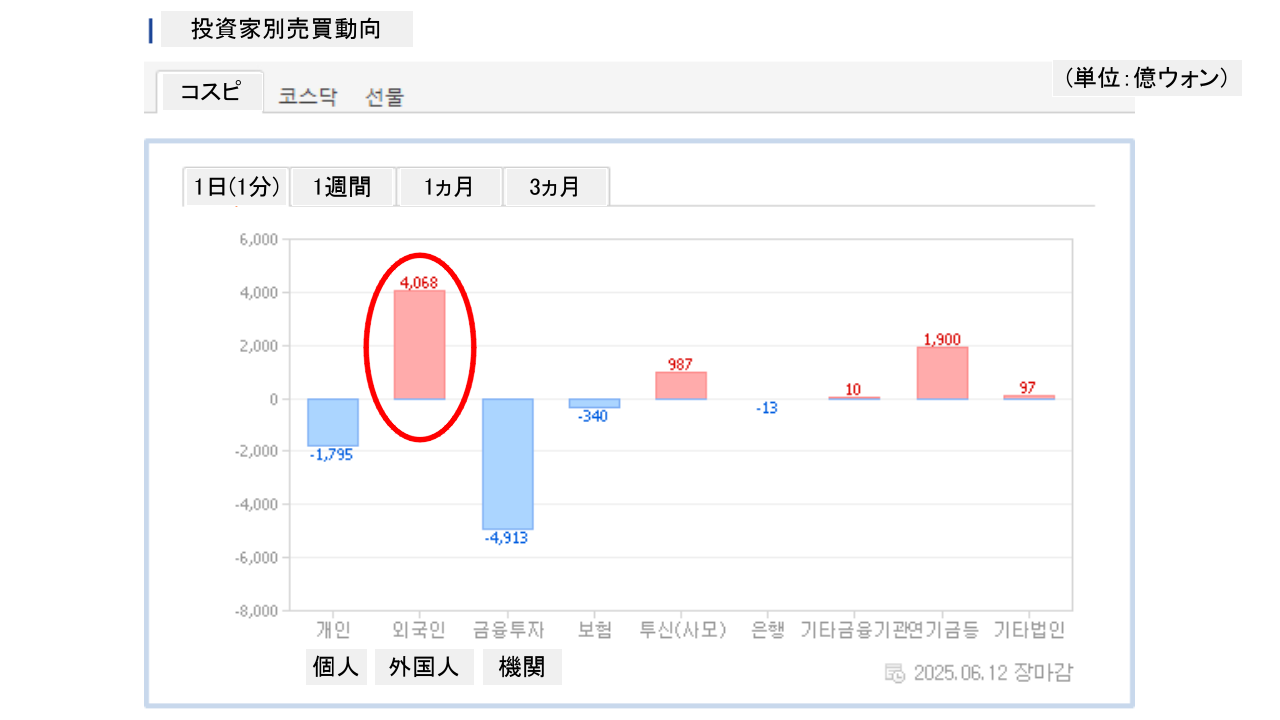 個人投資家は「1,795億ウォン」の売り越し。一方の外国人投資家は「4,068億ウォン」の買い越しです。