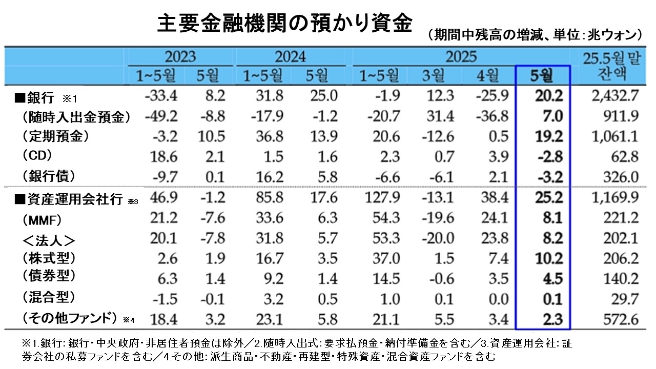 資産運用会社では前月比また前年同月比で高水準を維持しています。2025年05月も「+25.2兆ウォン」と大量の資金流入が継続しているのです。