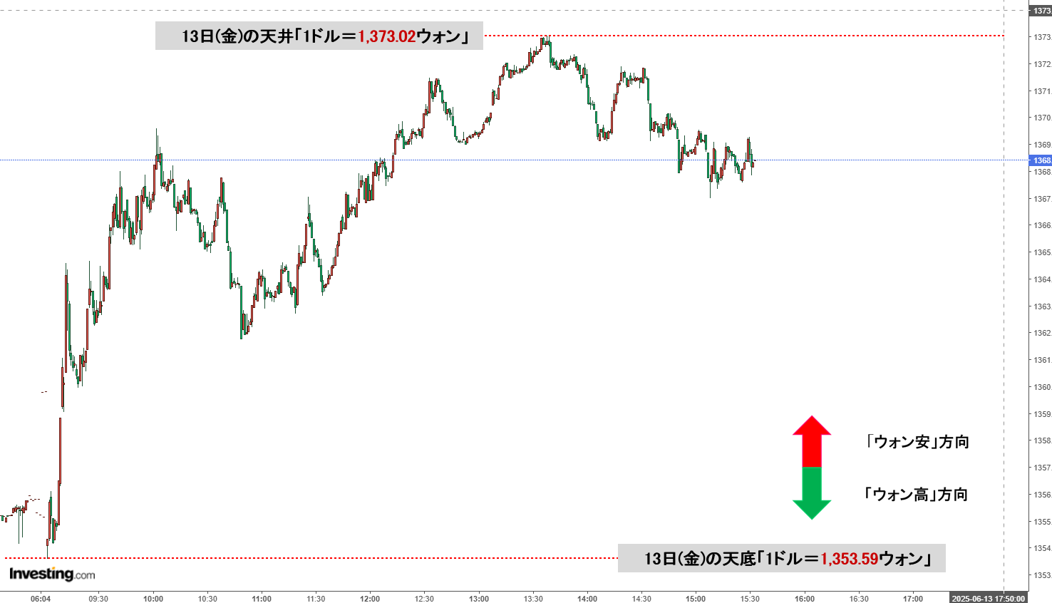 2025年06月13日(金)が(ほぼほぼ)締まりました。2025年06月14日 06:03現在、ドルウォンチャートは以下のようになっています(チャートは『Investing.com』より引用:以下同)。ローソク足1本が1分間の値動きを示す「...