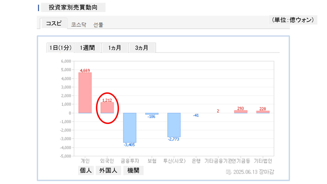 個人投資家は「4,669億ウォン」の買い越し。一方の外国人投資家は「1,212億ウォン」の買い越しです。
