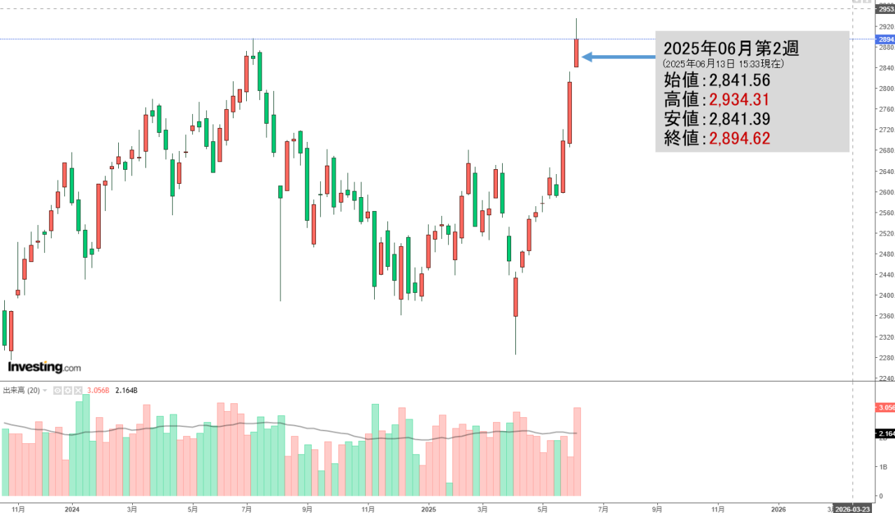これで2025年06月第2週目が締まりましたので、ローソク足1本が1週間の値動きを示す「週足」で見てみます。