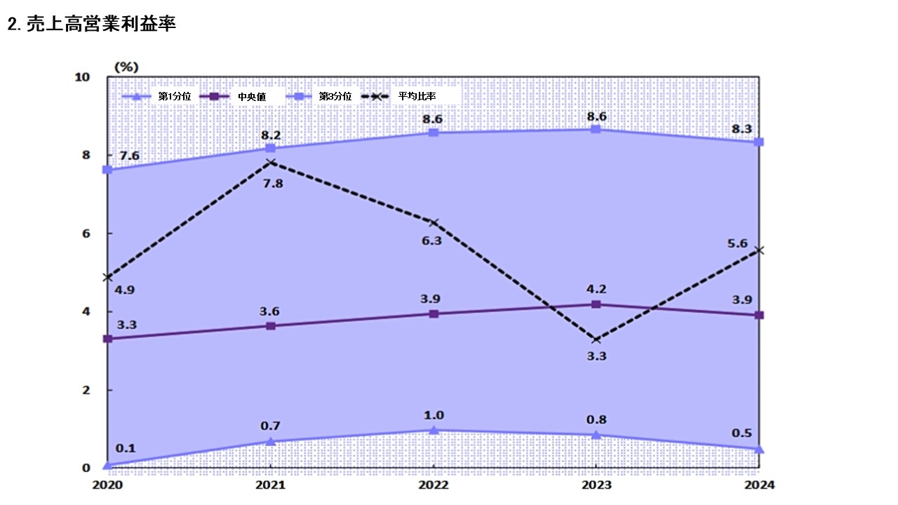 平均営業利益率の乱高下しています。2021年の7.8%をピークに、2023年には3.3%まで急落。2024年は5.6%に回復しましたが、これは恐らく一部の高利益企業の影響が大きく、利益構造の偏在が大きいことを示しています。