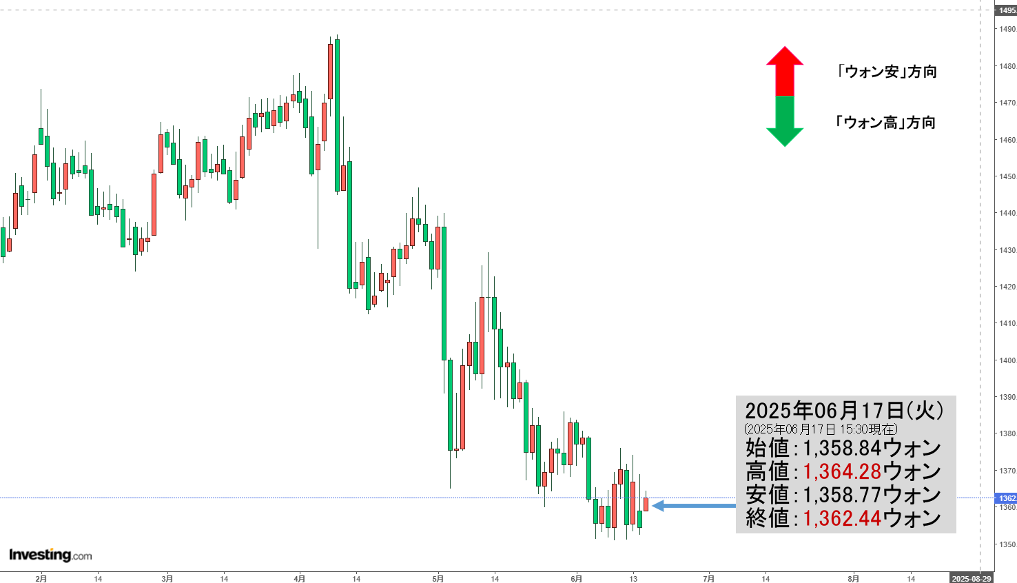 2025年06月17日(火)15:30現在、ドルウォンのチャートは以下のようになっています(チャートは『Investing.com』より引用)。