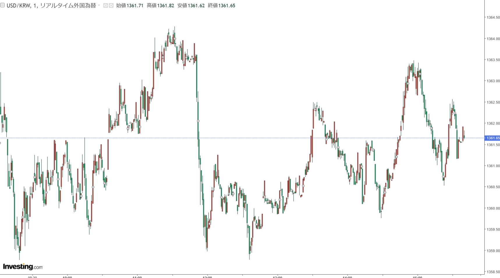 いまだ陽線を維持しています。現在のところ「1ドル=1,362ウォン」近辺の攻防となっています。