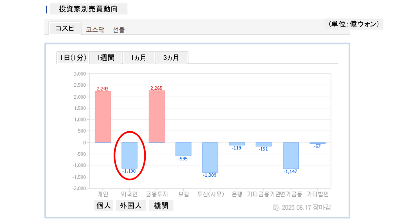 個人投資家は「2,243億ウォン」の買い越し。一方の外国人投資家は「1,130億ウォン」の売り越しです。