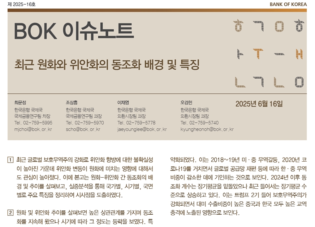 「BOKイシューノート 第2025-16号」で、中国・人民元と韓国・ウォンの連動性についてのものです。