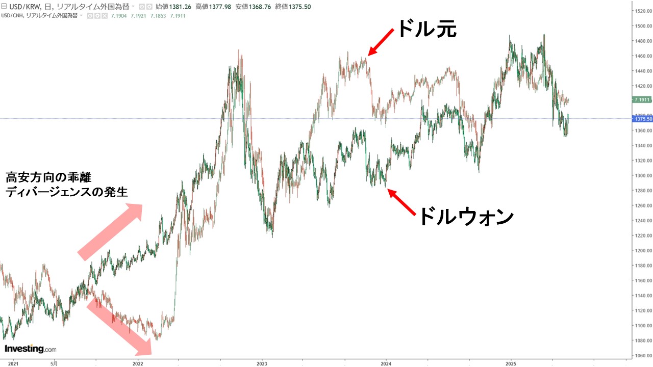 高安の見方はいつものドルウォンと同じで、チャートの上方向に進めば「その通貨がドルに対して安くなっていること」を示し、下方向に進めば「その通貨がドルに対して高くなっていること」を示しています。