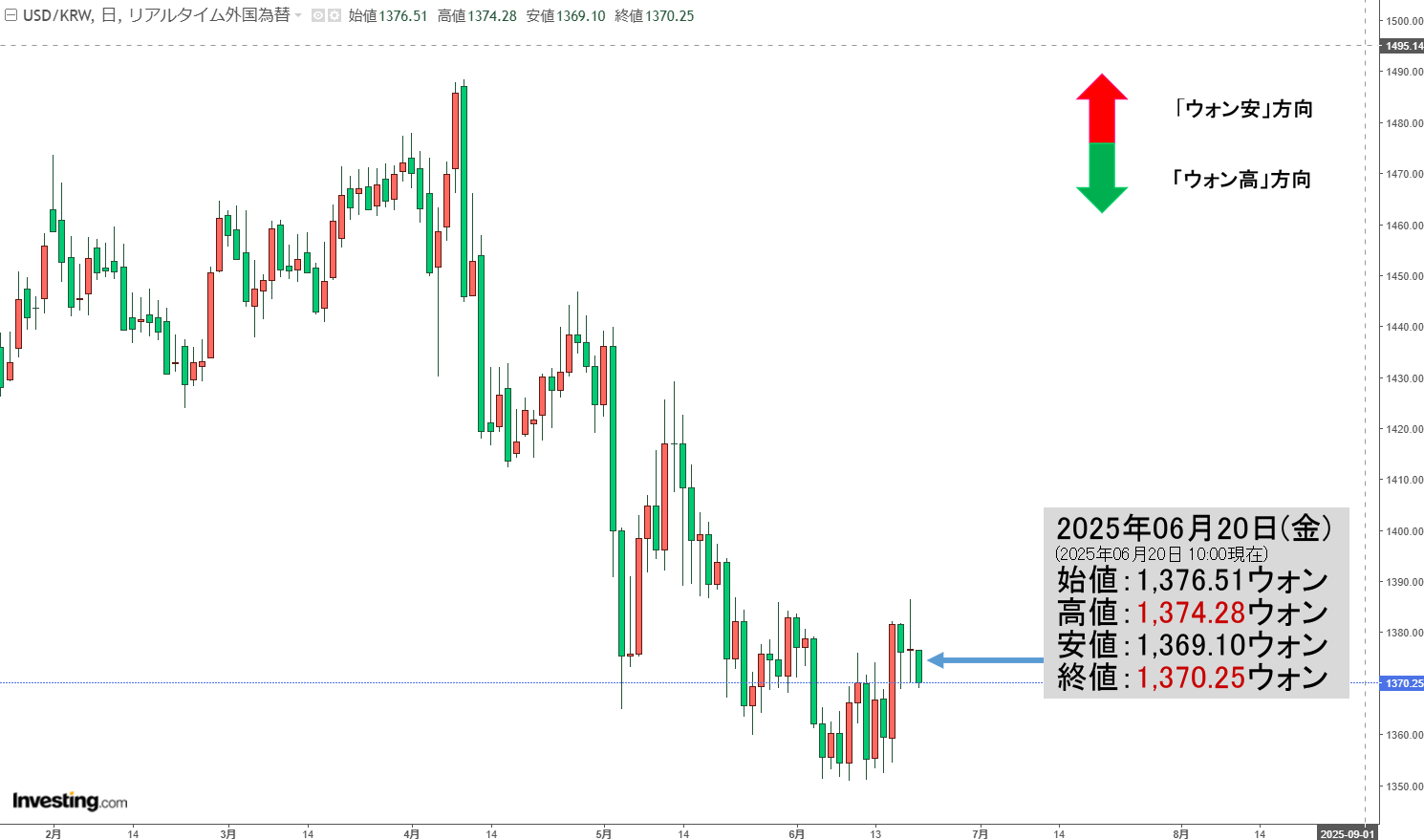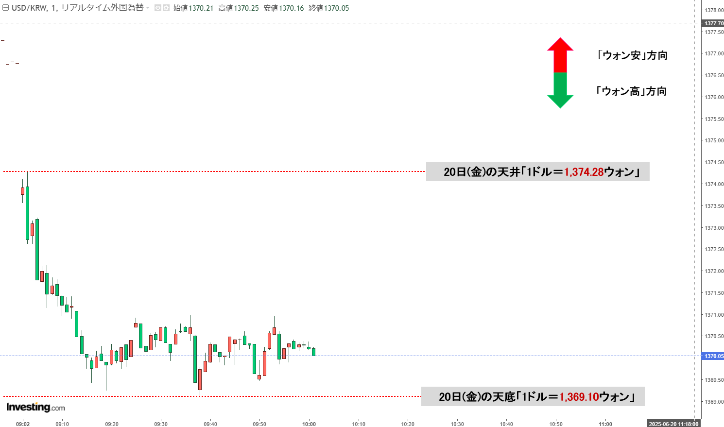 2025年06月20日(金)の市場が開きました。10:00現在、ドルウォンのチャートは以下のようになっています(チャートは『Investing.com』より引用)。