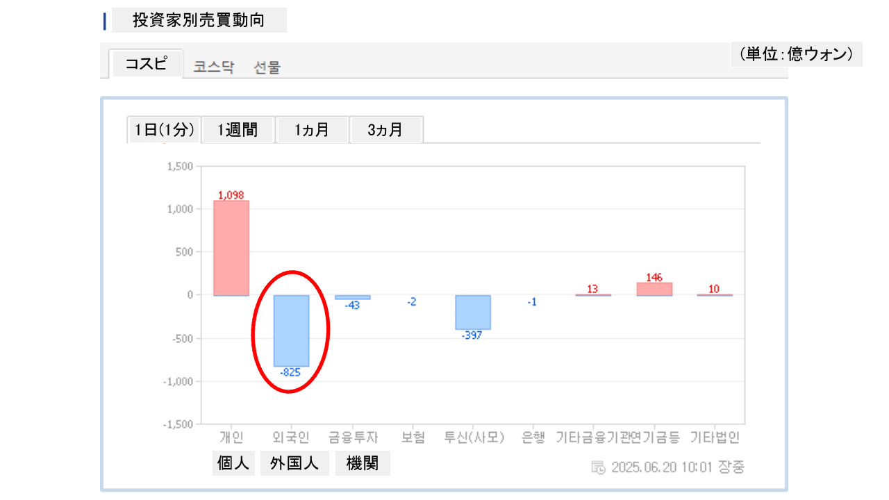 個人投資家は「1,038億ウォン」の買い越し。一方の外国人投資家は「825億ウォン」の売り越しです。
