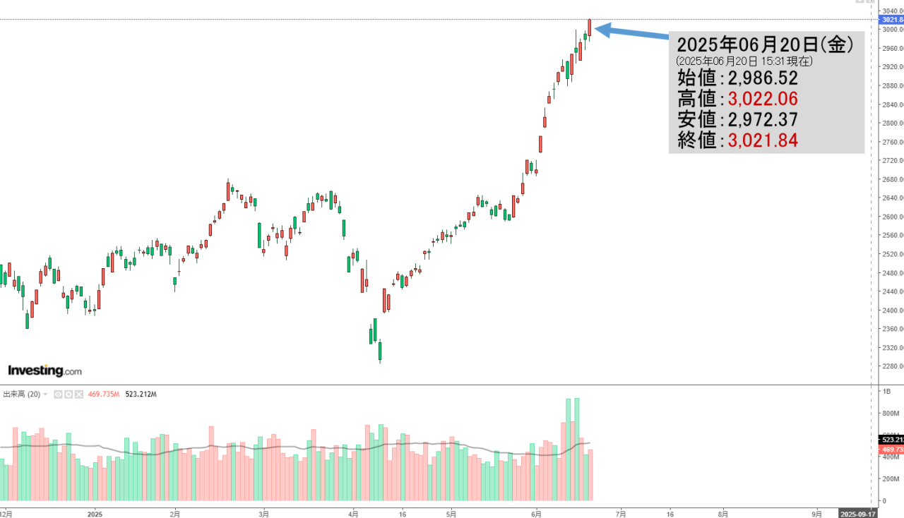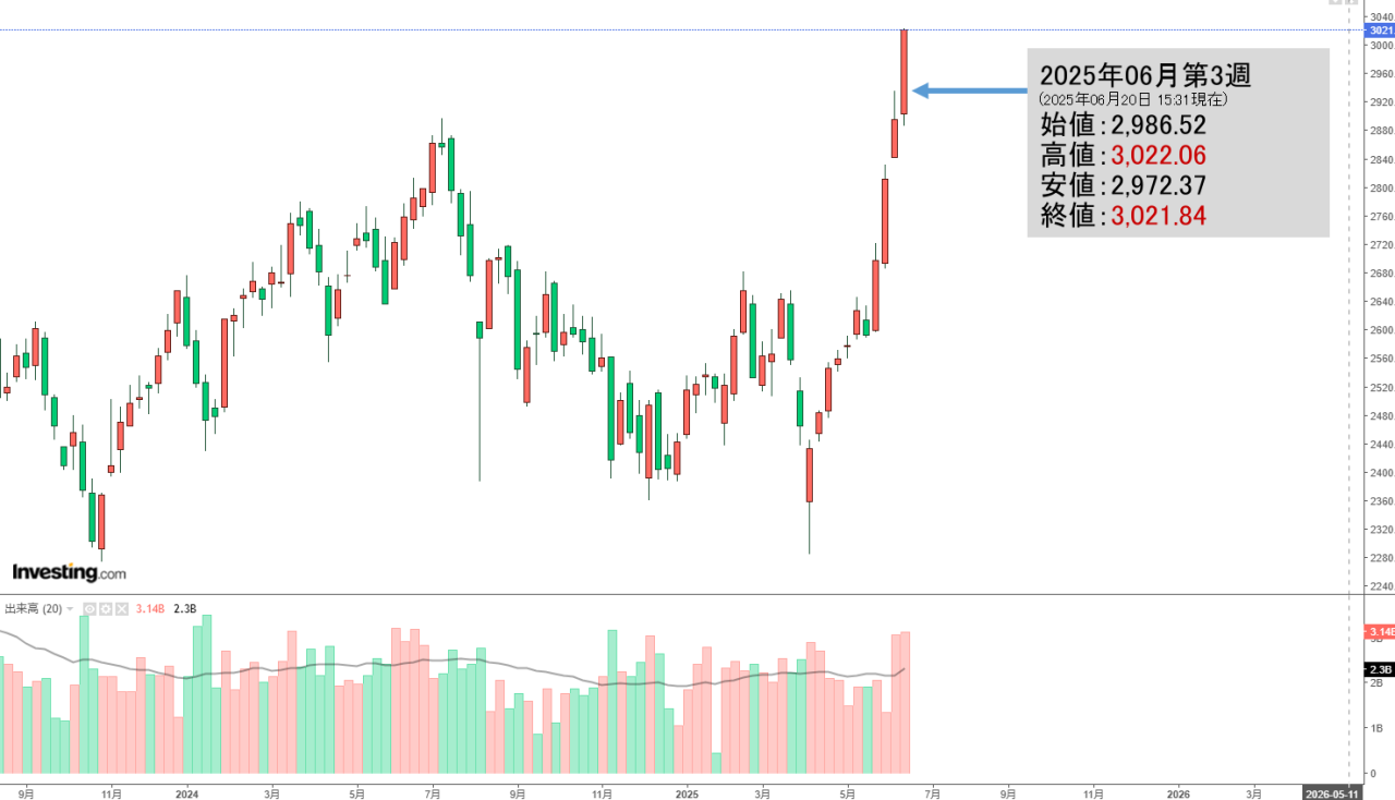 これで2025年06月第3週目が締まりましたので、ローソク足1本が1週間の値動きを示す「週足」で見てみます。
