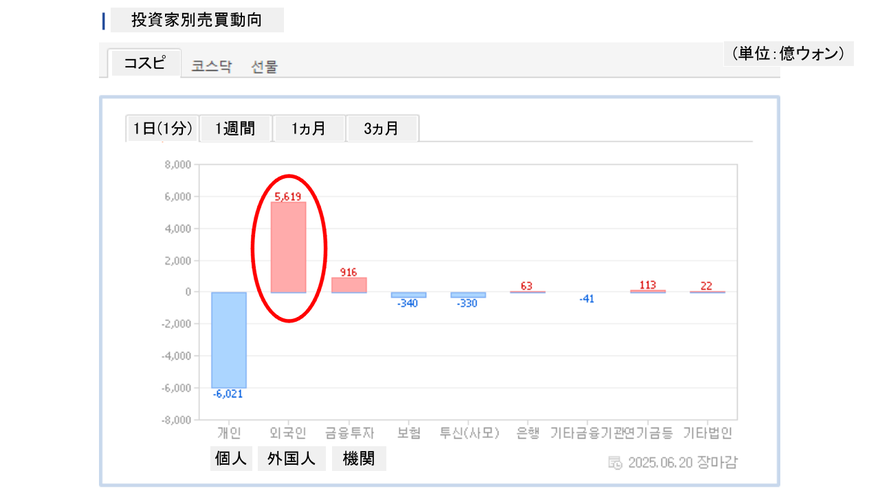 個人投資家は「6,021億ウォン」の売り越し。一方の外国人投資家は「5,619億ウォン」の買い越しです。