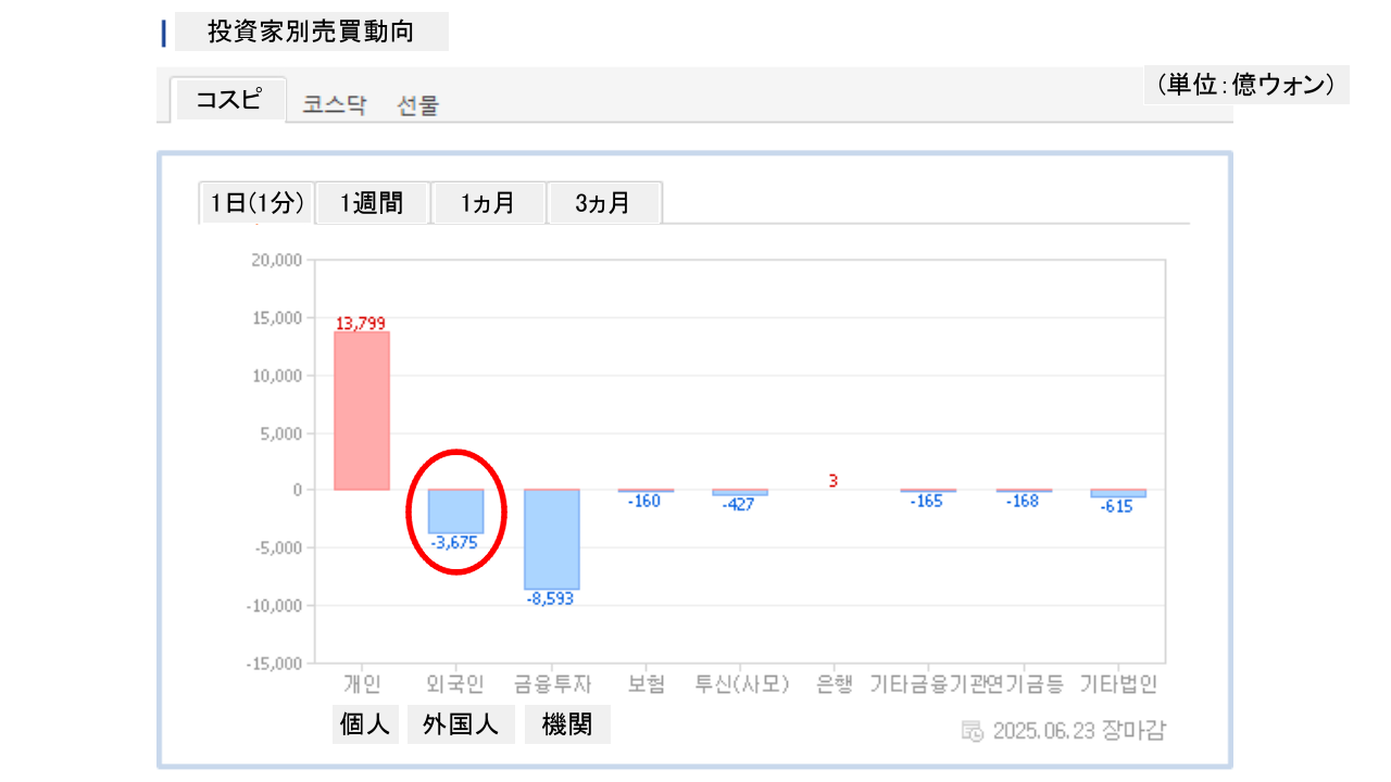 個人投資家は「1兆3,799億ウォン」の買い越し。一方の外国人投資家は「3,675億ウォン」の売り越しです。