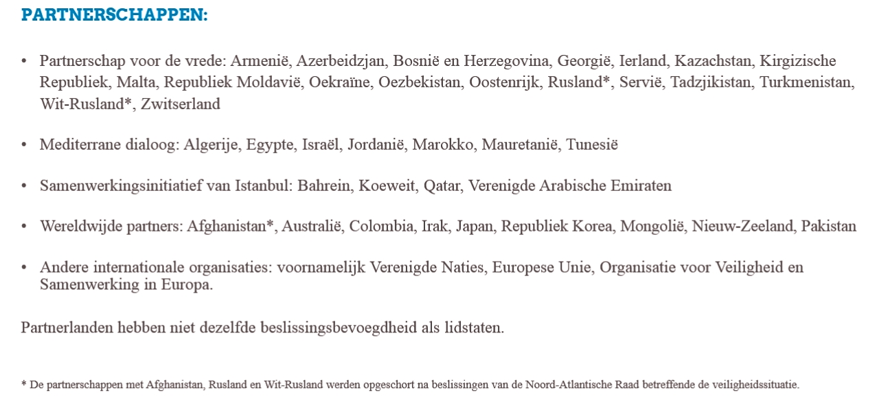 平和のためのパートナーシップ:アルメニア、アゼルバイジャン、ボスニア・ヘルツェゴビナ、ジョージア、アイルランド、カザフスタン、キルギス共和国、マルタ、モルドバ共和国、ウクライナ、ウズベキスタン、オーストリア、ロシア*、セルビア、タジキスタン、トルクメニスタン、ベラルーシ*、スイス地中海対話:アルジェリア、エジプト、イスラエル、ヨルダン、モロッコ、モーリタニア、チュニジア