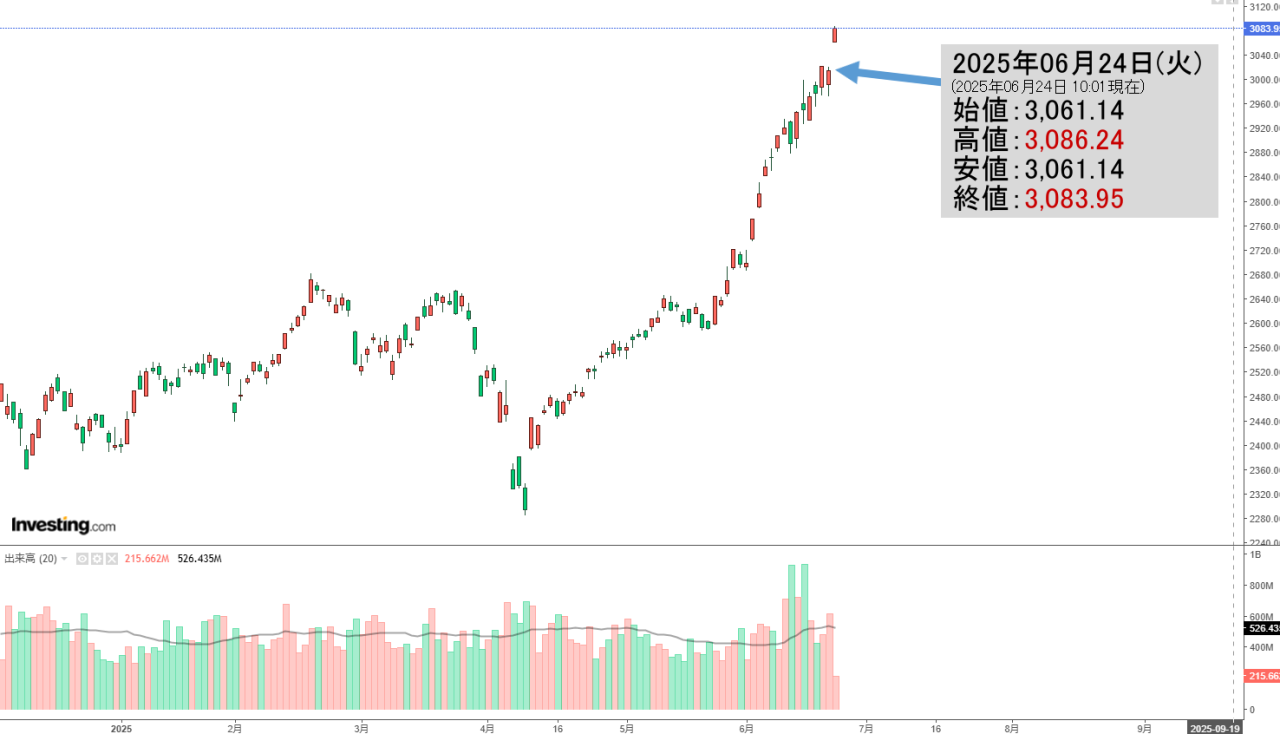 2025年06月24日(火)の韓国株式市場が締まりました。15:31現在、KOSPI(韓国総合株価指数)のチャートは以下のようになっています(チャートは『Investing.com』より引用)。やりました! 陽線が伸びて3,100を超えまし...