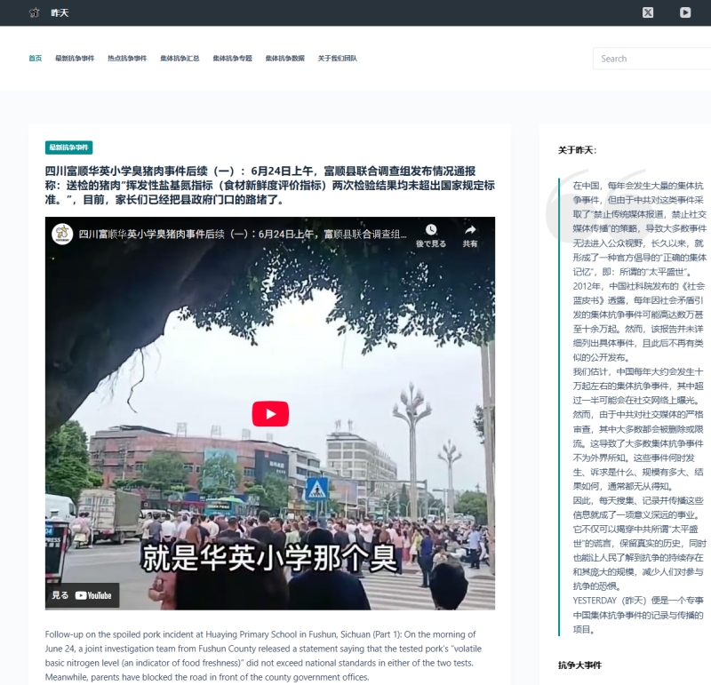 「YESTERDAY」は、中国における集団抗議活動の記録と発信に特化したプロジェクトです。