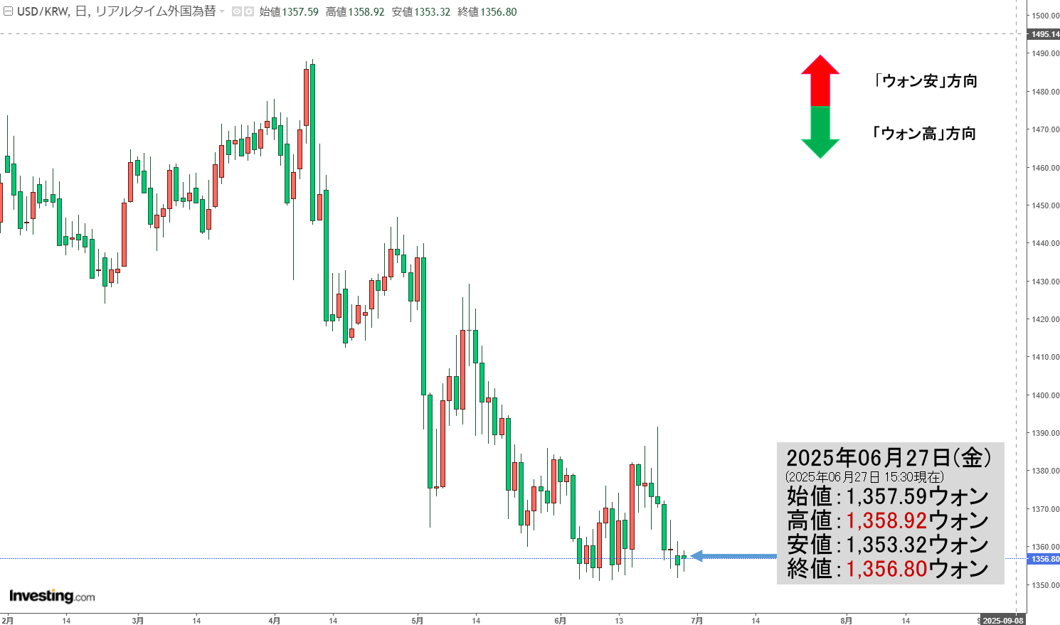 2025年06月27日(金)が(ほぼほぼ)締まりました。2025年06月28日 09:51現在、ドルウォンチャートは以下のようになっています(チャートは『Investing.com』より引用:以下同)。陽線が伸びて締まりました。「1ドル=1...