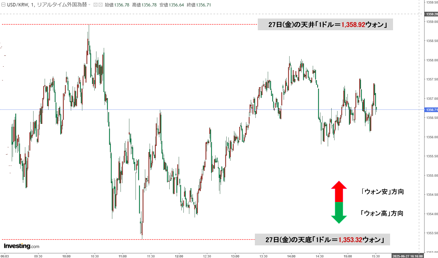 2025年06月27日(金)が(ほぼほぼ)締まりました。2025年06月28日 06:01現在、ドルウォンチャートは以下のようになっています(チャートは『Investing.com』より引用:以下同)。ローソク足1本が1分間の値動きを示す「…