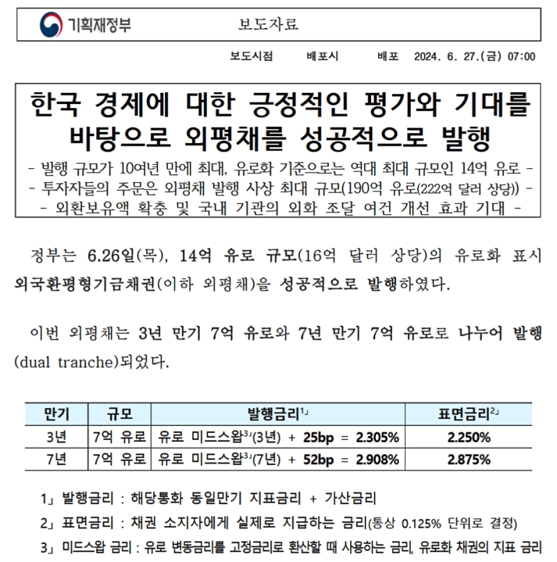韓国経済に対する肯定的な評価と期待を背景に 外平債を成功裏に発行