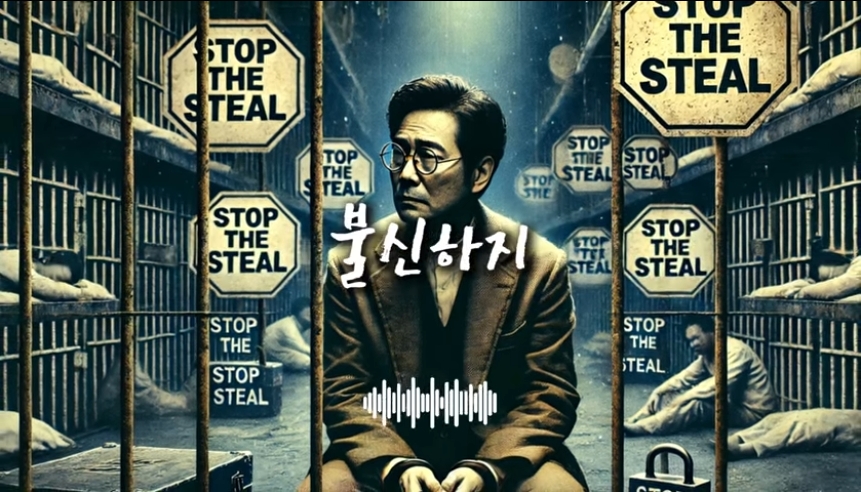 「STOP THE STEAL」のスローガンを背景に、メガネをかけた人物が拘束されている画像です。