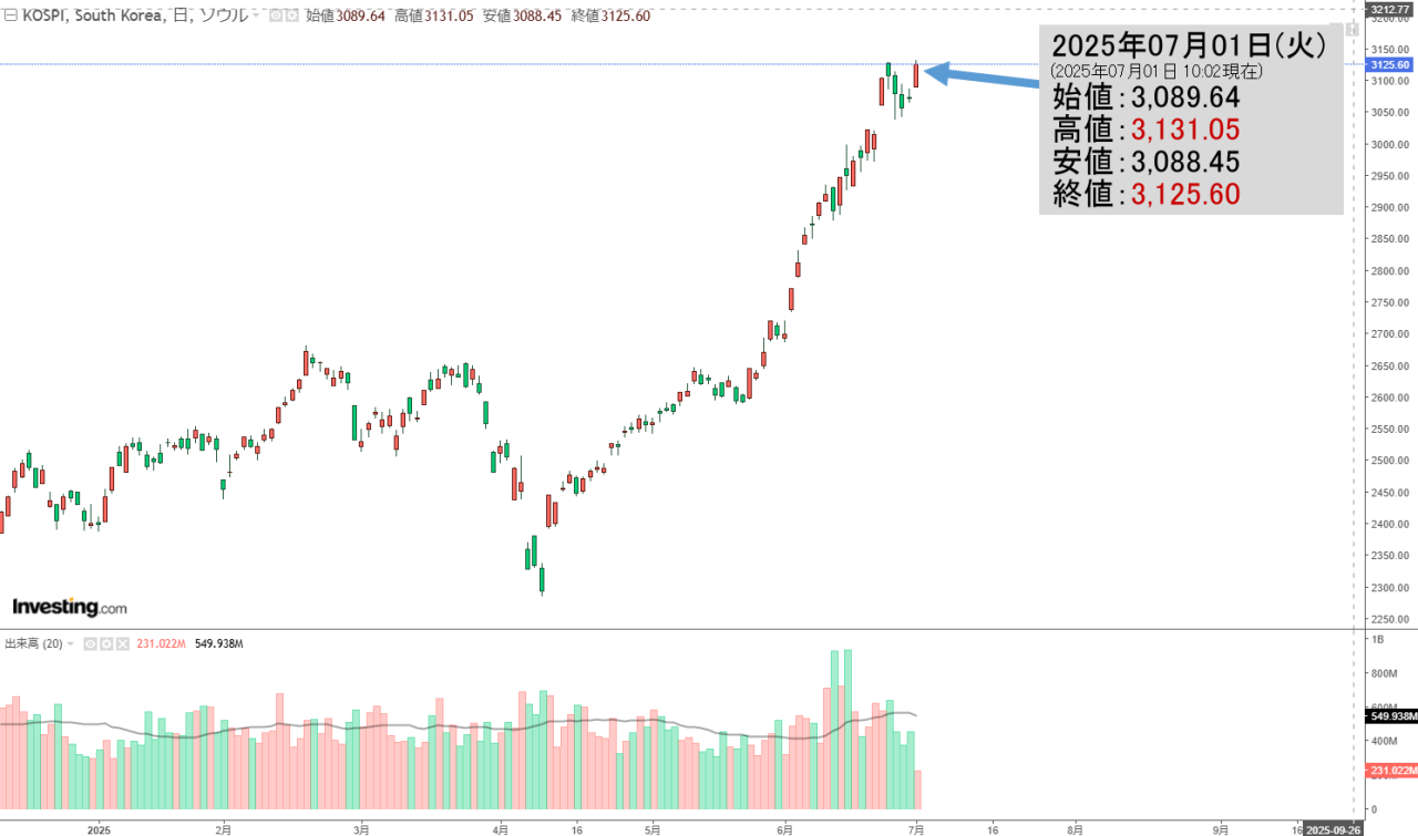 2025年07月01日(火)の韓国株式市場が開きました。10:02現在、KOSPI(韓国総合株価指数)のチャートは以下のようになっています(チャートは『Investing.com』より引用)。