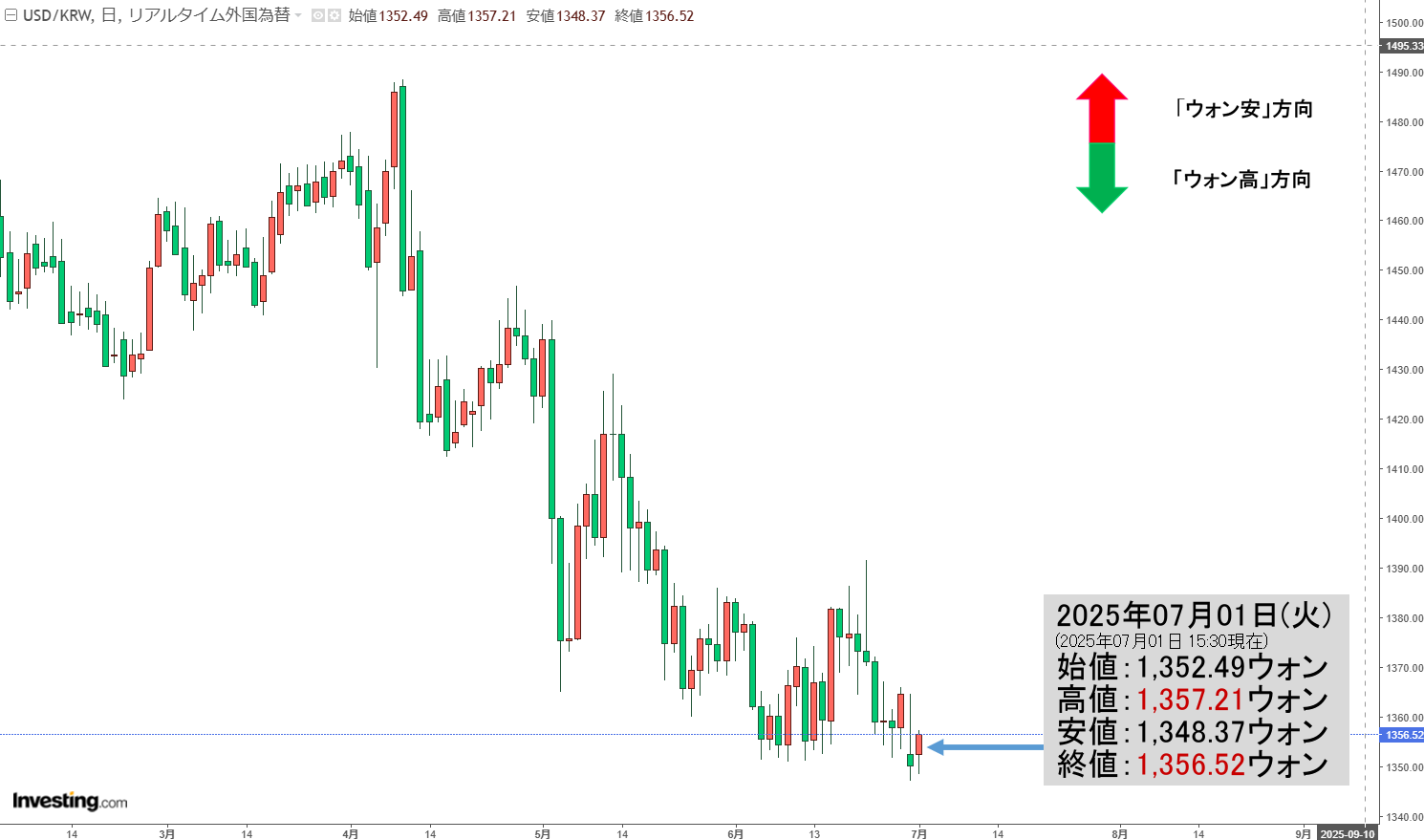 「ドルウォン」01日(火)夕刻・「1,356ウォン」陽線。 広告 ドルウォン X Facebook はてブ Pocket LINE コピー 2025.07.01 おススメ記事 『Money1』 韓国は自前でウラン濃縮を行いたい ⇒ 日本は絶対に韓国の企図を潰すべき。 『Money1』 中国・王毅外相が「また」各国からボコられる。 『Money1』 米国トランプ大統領「かわいい軽自動車を米国で製造・販売できるようにする」⇒ 決して「K-自動車」ではありません。 『Money1』 韓国政府「ドル売り・ウォン買いせずにドルを温存する輸出企業には罰を科す」 『Money1』 韓国・李在明「ウラン濃縮は米韓5:5で事業にしようとトランプ大統領は言った」 『Money1』 『韓国銀行』が警告「過剰な家計負債は韓国経済の足かせ」 『Money1』 【韓国の外貨準備】11月「4,307億ドル」⇒ 対米投資2千億ドルのためにも積むしかない。 『Money1』 韓国「尹大統領の戒厳宣布から1年」⇒ 李在明「光の革命はノーベル平和賞に値する」 『Money1』 韓国「ドル預金が50億ドルも減った」⇒ 海外投資がウォン安を進行させる。 『Money1』 「韓国通貨危機時のKIKO騒動」みたいになるのではあるまいな――という話。 『Money1』 中国 vs 韓国「黄海で中国漁船が次々に転覆」 『Money1』 韓国・李在明「尹錫悦をナチ戦犯のように処分せよ」 『Money1』 ベネスエラに巨額の中国マネー1,060億ドルが流入した。 『Money1』 韓国政府「ウォン安止めるのに必死」⇒ 「船頭多くして船山に登る」的な組織が船出。 『Money1』 韓国11月貿易収支:97.3億ドル。対中国は1.1億ドルなんとか貿易黒字。 『Money1』 韓国債3年物、利回り3.000%を突破。 『Money1』 中国「限日令」。中国政府に屈していてはロックなどできない。 『Money1』 韓国ウォンは最弱通貨――という話。 『Money1』 韓国クーパン「前代未聞3,370万人の個人情報流出」⇒ 警察は中国国籍の人物を調査。 『Money1』 高市政権は「日韓通貨スワップ」を停止するか。 『Money1』 中国「バスケ中国代表が3年ぶりに韓国に負けた。ちくしょー」⇒ 韓国メディア歓喜「大韓民国は万里の長城を越えた」 『Money1』 中国の金を追う「中国の外国融資&無償資金供与は推定されてきた数字の2~4倍ある!」 『Money1』 『韓国銀行』「2025~2027年は経済成長率は1%台」予測 ⇒ 現実になれば史上最悪。 『Money1』 中国「一日に鉄道事故が2件起こり13人が死亡」⇒ 中国当局は安全確保の努力をしているのか。 『Money1』 『韓国銀行』李昌鏞総裁の警告「高値づかみになるぞ」は現在も有効か。 『Money1』 韓国「生産・消費・設備投資」推移⇒ 設備投資が激減「-14%」半導体の生産が「-26%」 『Money1』 中国・今度は船火事「8隻を巻き込む大火に」⇒ いくらなんでも火事が多すぎる。 『Money1』 韓国「1ドル=1,500ウォン」を超える。 『Money1』 韓国「在韓米軍の工事で230億せしめる詐欺」⇒ ずさん工事で発覚。合衆国も調査に乗り出す 『Money1』 韓国・李在明が消費クーポンをまいたが「実質消費は減った」⇒ 3四半期連続の減少。どうするのコレ 『Money1』 中国・香港では大火でマンション丸焼け、安徽省では大爆発。 『Money1』 【追記・修正】ポーランド「韓国産潜水艦はいらない」⇒ スウェーデンSAAB「A26」の勝ち! 『Money1』 韓国金融通貨委員会「基準金利:2.50%」で据え置き。 『Money1』 韓国企財部長官「ニュー・フレームワークだ」⇒ 国民年金の資産を使えないものか。 『Money1』 韓国「米韓戦略的投資のための特別法」やっと発議 ⇒ これでMOU正式公表に至るか。 『Money1』 韓国「帰ってきた李在明」さっそく司法リスクに対応。 Fact1 日本の誇る海洋資源調査船『白嶺』は先進技術の塊! Fact1 夏の甲子園、優勝校を最も多く輩出している都道府県とは? Fact1 今話題の「楽天ライオンズ」とは? Fact1 奇跡の毛色「白毛馬」とは? Fact1 全て勝つといくら? 競馬GI競走で勝利騎手がもらえる賞金とは? Fact1 平成仮面ライダーの意外すぎるモチーフとは? Fact1 発表から2日で大崩壊、鳴かず飛ばずに終わりそうなスーパーリーグとは? Fact1 日本人マスターズ挑戦の歴史。松山以前に最高位だった選手とは? Fact1 甲子園通算本塁打、最多の清原に次いで多く打っている意外な選手とは? Fact1 セレクトセールの高額取引馬が稼いだ金額とは? 2025年07月01日(火)15:30現在、ドルウォンのチャートは以下のようになっています(チャートは『Investing.com』より引用)。 陽線ですが……。現在のところ「1ドル=1,356ウォン」近辺の攻防となっています。 現在の天井は「1ドル=1,357.21ウォン」、天底は「1ドル=1,348.37ウォン」です。 また動きがありましたら、随時記事を制作し状況をご紹介するようにいたします。 (柏ケミカル@dcp) 広告
