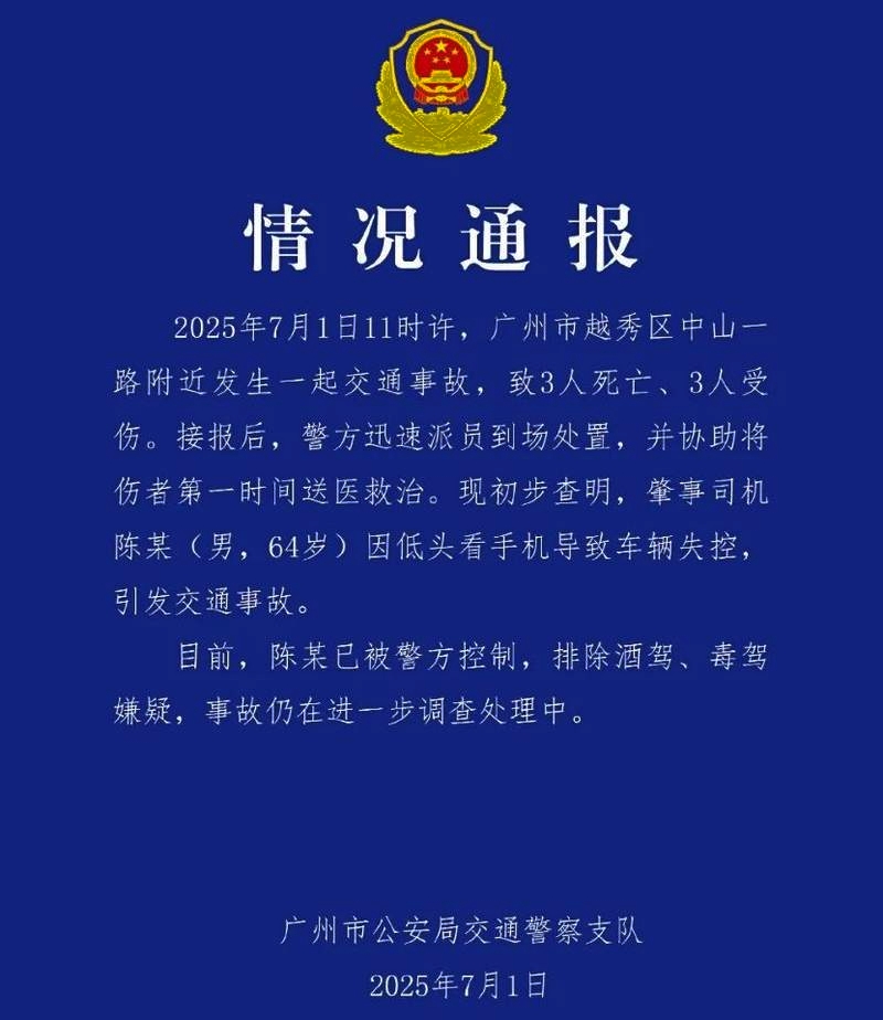 2025年07月01日11時頃、広州市越秀区中山一路付近において交通事故が発生し、3名が死亡、3名が負傷しました。通報を受け、警察は迅速に警察官を現場に派遣し、負傷者の救助および救急搬送を支援しました。