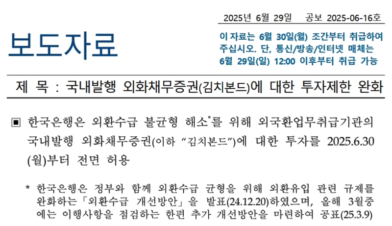 ▣ 韓国銀行は、外国為替需給の不均衡の解消のため、外国為替業務取扱機関による国内発行外貨債務証券(以下「キムチ債」)への投資を2025年06月30日(月)から全面的に許可する。