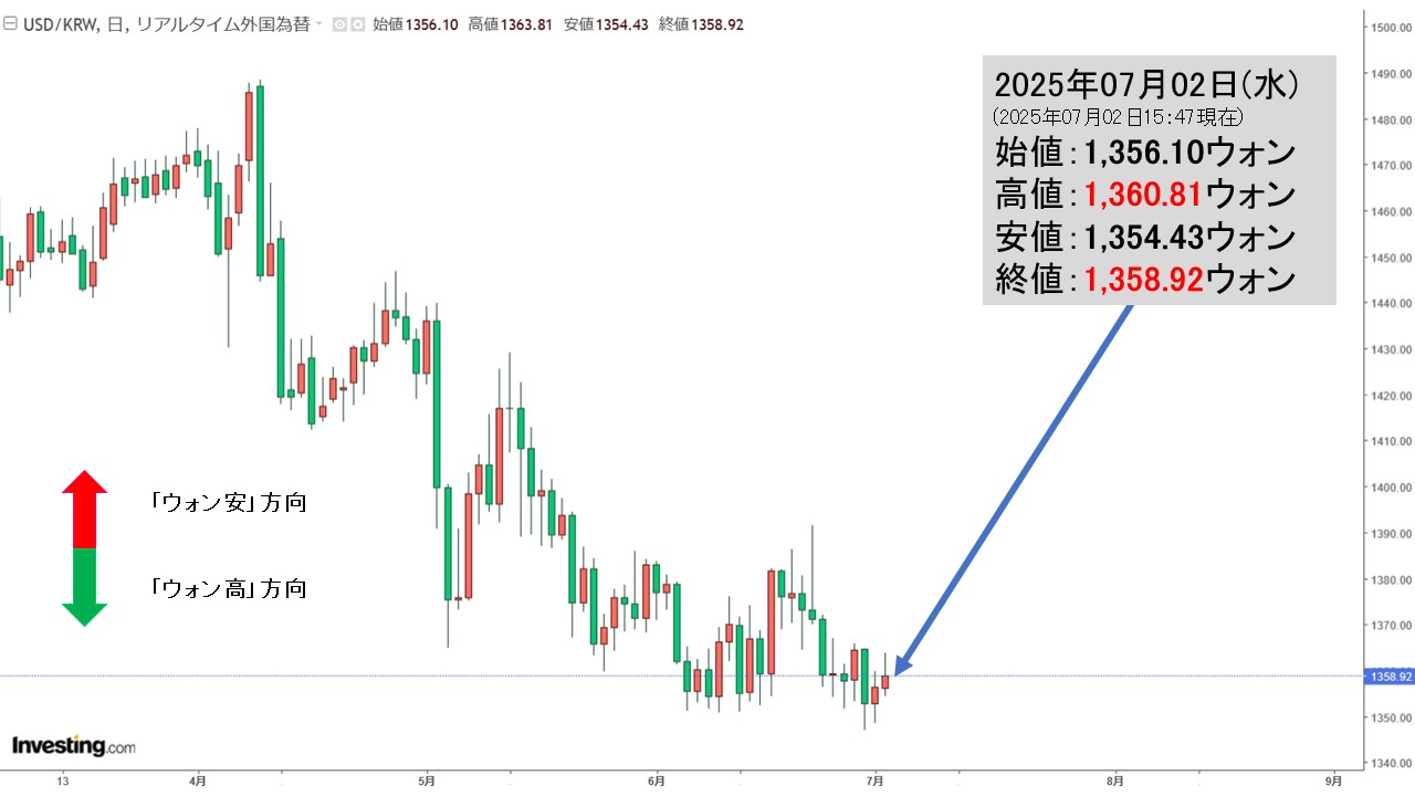 「ドルウォン」02日(水)夕刻・「1,358ウォン」まだ陽線。 広告 トピック X Facebook はてブ Pocket LINE コピー 2025.07.02 おススメ記事 『Money1』 中国商務部「それはそれとして、中国に投資してね」 『Money1』 韓国は自前でウラン濃縮を行いたい ⇒ 日本は絶対に韓国の企図を潰すべき。 『Money1』 中国・王毅外相が「また」各国からボコられる。 『Money1』 米国トランプ大統領「かわいい軽自動車を米国で製造・販売できるようにする」⇒ 決して「K-自動車」ではありません。 『Money1』 韓国政府「ドル売り・ウォン買いせずにドルを温存する輸出企業には罰を科す」 『Money1』 韓国・李在明「ウラン濃縮は米韓5:5で事業にしようとトランプ大統領は言った」 『Money1』 『韓国銀行』が警告「過剰な家計負債は韓国経済の足かせ」 『Money1』 【韓国の外貨準備】11月「4,307億ドル」⇒ 対米投資2千億ドルのためにも積むしかない。 『Money1』 韓国「尹大統領の戒厳宣布から1年」⇒ 李在明「光の革命はノーベル平和賞に値する」 『Money1』 韓国「ドル預金が50億ドルも減った」⇒ 海外投資がウォン安を進行させる。 『Money1』 「韓国通貨危機時のKIKO騒動」みたいになるのではあるまいな――という話。 『Money1』 中国 vs 韓国「黄海で中国漁船が次々に転覆」 『Money1』 韓国・李在明「尹錫悦をナチ戦犯のように処分せよ」 『Money1』 ベネスエラに巨額の中国マネー1,060億ドルが流入した。 『Money1』 韓国政府「ウォン安止めるのに必死」⇒ 「船頭多くして船山に登る」的な組織が船出。 『Money1』 韓国11月貿易収支:97.3億ドル。対中国は1.1億ドルなんとか貿易黒字。 『Money1』 韓国債3年物、利回り3.000%を突破。 『Money1』 中国「限日令」。中国政府に屈していてはロックなどできない。 『Money1』 韓国ウォンは最弱通貨――という話。 『Money1』 韓国クーパン「前代未聞3,370万人の個人情報流出」⇒ 警察は中国国籍の人物を調査。 『Money1』 高市政権は「日韓通貨スワップ」を停止するか。 『Money1』 中国「バスケ中国代表が3年ぶりに韓国に負けた。ちくしょー」⇒ 韓国メディア歓喜「大韓民国は万里の長城を越えた」 『Money1』 中国の金を追う「中国の外国融資&無償資金供与は推定されてきた数字の2~4倍ある!」 『Money1』 『韓国銀行』「2025~2027年は経済成長率は1%台」予測 ⇒ 現実になれば史上最悪。 『Money1』 中国「一日に鉄道事故が2件起こり13人が死亡」⇒ 中国当局は安全確保の努力をしているのか。 『Money1』 『韓国銀行』李昌鏞総裁の警告「高値づかみになるぞ」は現在も有効か。 『Money1』 韓国「生産・消費・設備投資」推移⇒ 設備投資が激減「-14%」半導体の生産が「-26%」 『Money1』 中国・今度は船火事「8隻を巻き込む大火に」⇒ いくらなんでも火事が多すぎる。 『Money1』 韓国「1ドル=1,500ウォン」を超える。 『Money1』 韓国「在韓米軍の工事で230億せしめる詐欺」⇒ ずさん工事で発覚。合衆国も調査に乗り出す 『Money1』 韓国・李在明が消費クーポンをまいたが「実質消費は減った」⇒ 3四半期連続の減少。どうするのコレ 『Money1』 中国・香港では大火でマンション丸焼け、安徽省では大爆発。 『Money1』 【追記・修正】ポーランド「韓国産潜水艦はいらない」⇒ スウェーデンSAAB「A26」の勝ち! 『Money1』 韓国金融通貨委員会「基準金利:2.50%」で据え置き。 『Money1』 韓国企財部長官「ニュー・フレームワークだ」⇒ 国民年金の資産を使えないものか。 『Money1』 韓国「米韓戦略的投資のための特別法」やっと発議 ⇒ これでMOU正式公表に至るか。 Fact1 日本の誇る海洋資源調査船『白嶺』は先進技術の塊! Fact1 夏の甲子園、優勝校を最も多く輩出している都道府県とは? Fact1 今話題の「楽天ライオンズ」とは? Fact1 奇跡の毛色「白毛馬」とは? Fact1 全て勝つといくら? 競馬GI競走で勝利騎手がもらえる賞金とは? Fact1 平成仮面ライダーの意外すぎるモチーフとは? Fact1 発表から2日で大崩壊、鳴かず飛ばずに終わりそうなスーパーリーグとは? Fact1 日本人マスターズ挑戦の歴史。松山以前に最高位だった選手とは? Fact1 甲子園通算本塁打、最多の清原に次いで多く打っている意外な選手とは? Fact1 セレクトセールの高額取引馬が稼いだ金額とは? 2025年07月02日(水)15:30現在、ドルウォンのチャートは以下のようになっています(チャートは『Investing.com』より引用)。 ローソク足の上が削られましたが、一応まだ陽線。現在のところ「1ドル=1,358ウォン」近辺の攻防となっています。 現在の天井は「1ドル=1,363.81ウォン」、天底は「1ドル=1,354.43ウォン」です。 また動きがありましたら、随時記事を制作し状況をご紹介するようにいたします。 (柏ケミカル@dcp) 広告