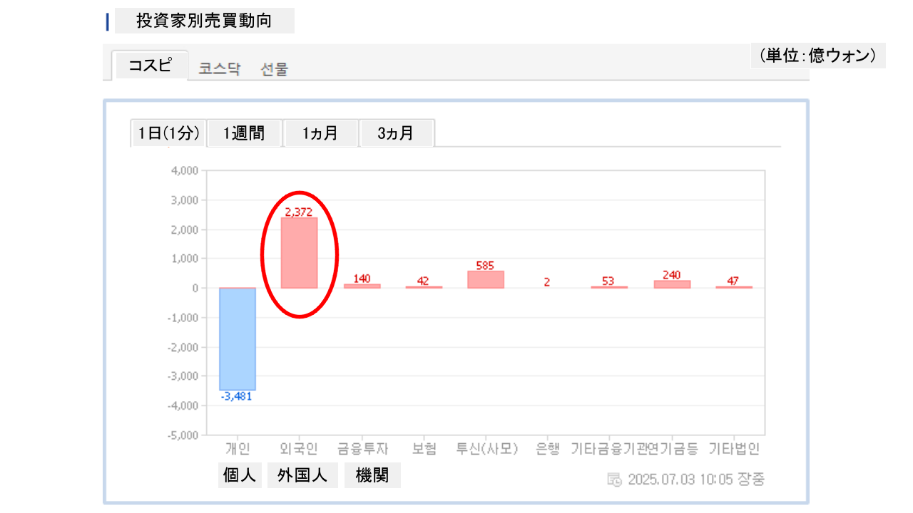 個人投資家は「3,481億ウォン」の売り越し。一方の外国人投資家は「2,372億ウォン」の買い越しです。