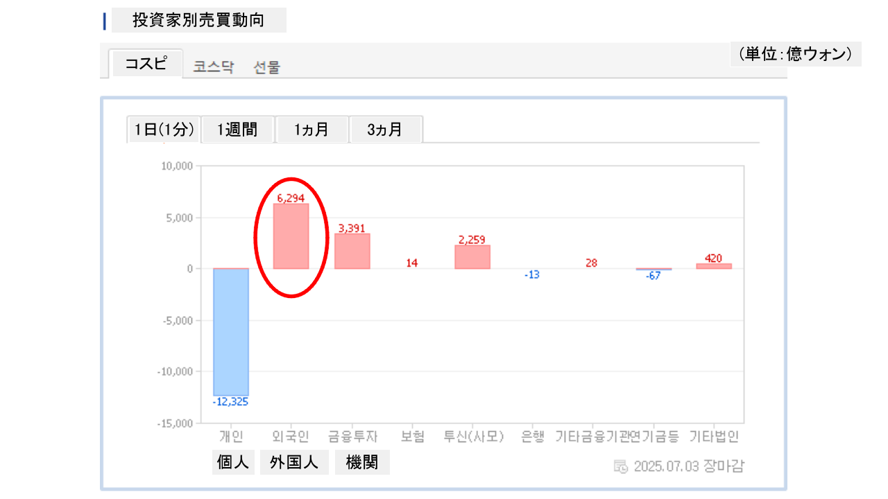 個人投資家は「1兆2,325億ウォン」の売り越し。一方の外国人投資家は「6,294億ウォン」の買い越しです。