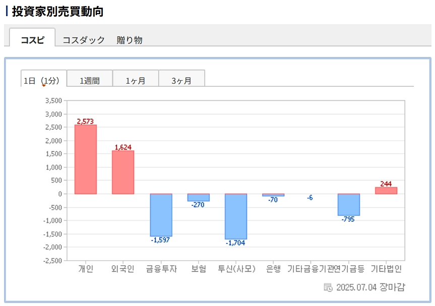 個人投資家は「2,573億ウォン」の買い越し。一方の外国人投資家は「1,624億ウォン」の買い越しです。