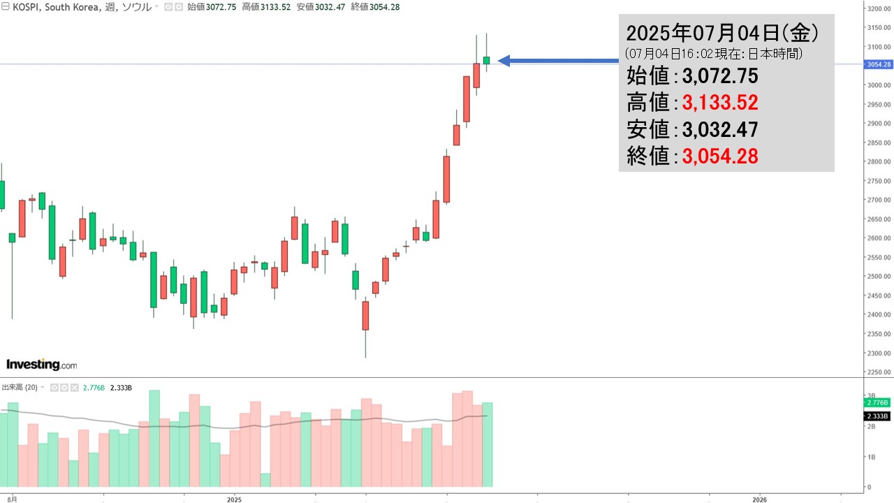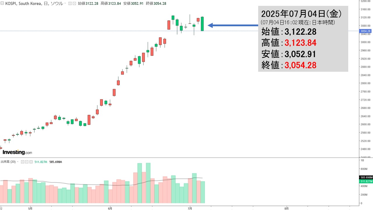 2025年07月04日(金)の韓国株式市場が締まりました。16:04現在、KOSPI(韓国総合株価指数)のチャートは以下のようになっています(チャートは『Investing.com』より引用)。