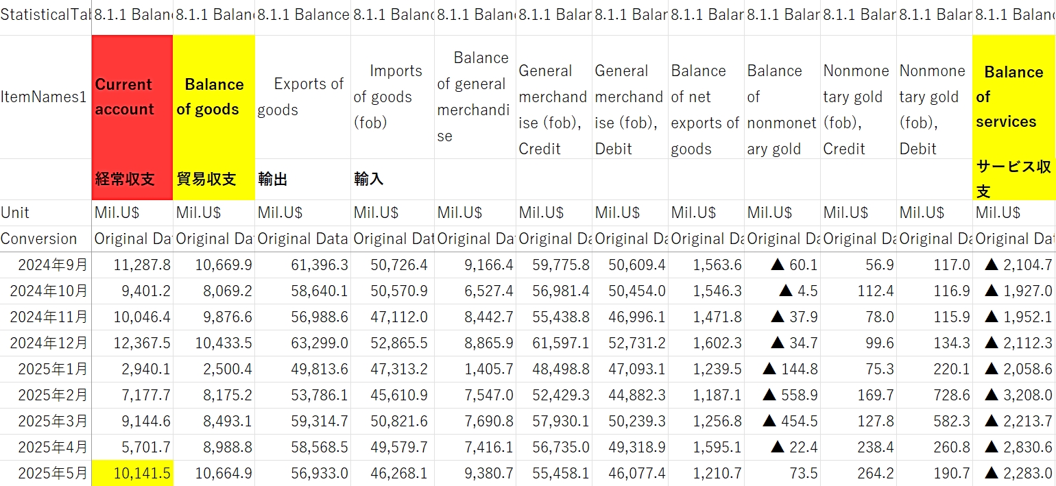 2024年01月~2025年05月の平均「輸入額」は「491億5,660万ドル」です。当月は462億6,810万ドルですから、輸入額が小さく済んだぶん貿易収支が大きくなったのです。