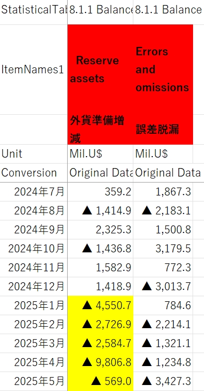 ↑黄色でフォーカスしているのが2025年01~05月の「外貨準備の増減」です。▲は「マイナス」の意味です。⇒データ出典:『韓国銀行』公式サイト「ECOS」