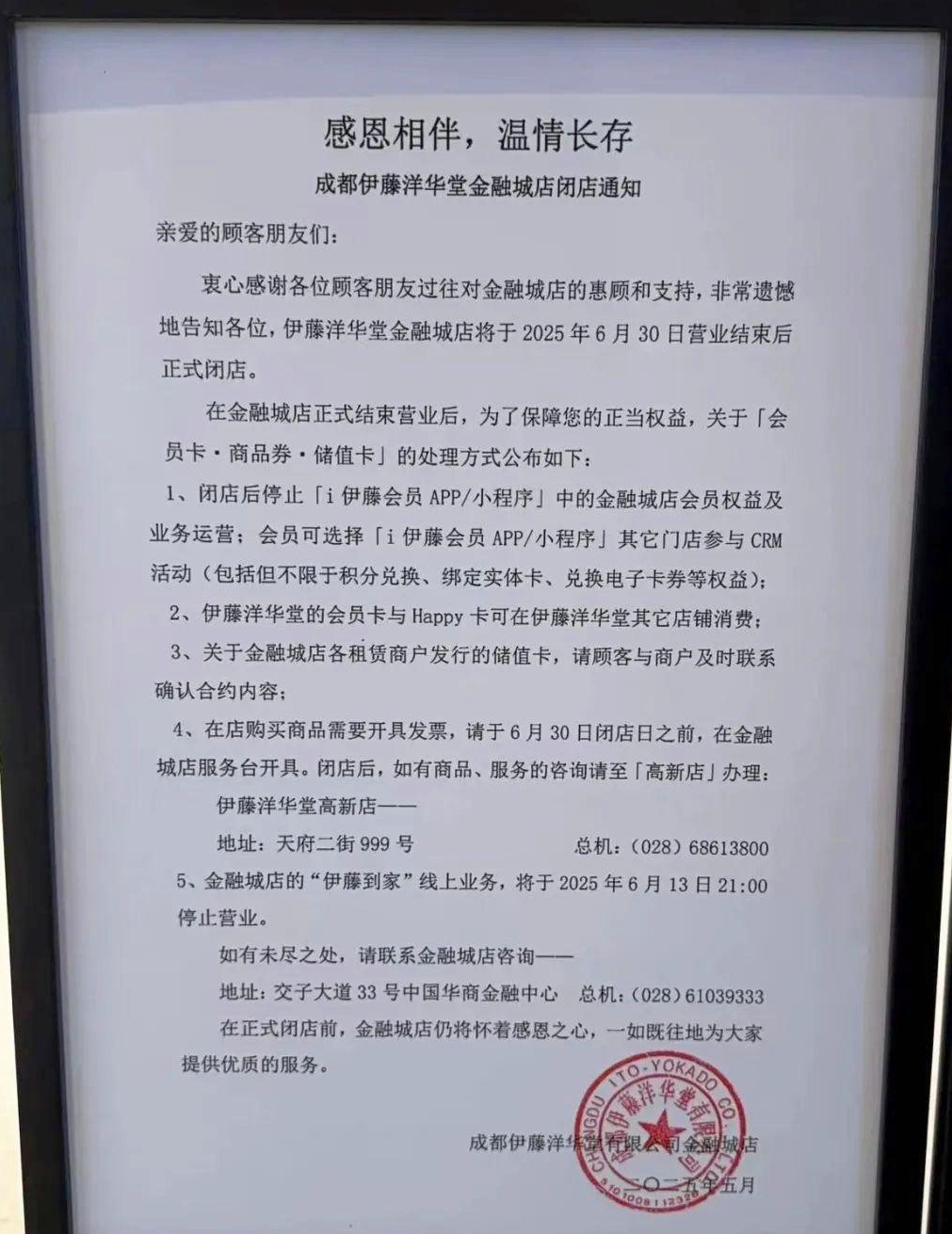2025年06月30日、日系の伊藤洋华堂(イトーヨーカドー)成都市・金融城店が正式に閉店しました。2022年01月に開店してからわずか三年半の閉店となりました。