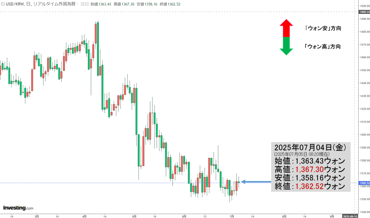2025年07月04日(金)が(ほぼほぼ)締まりました。2025年07月05日 08:22現在、ドルウォンチャートは以下のようになっています(チャートは『Investing.com』より引用:以下同)。