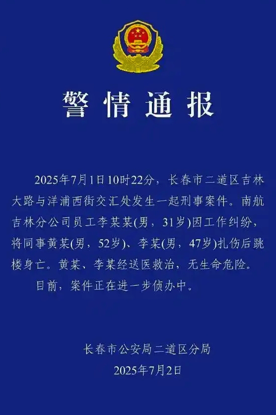 中国南方航空吉林支社の社員、李某某(男性、31歳)は、仕事上のトラブルにより、同僚の黄某(男性、52歳)、李某(男性、47歳)を刺した後、ビルから飛び降りて死亡した。