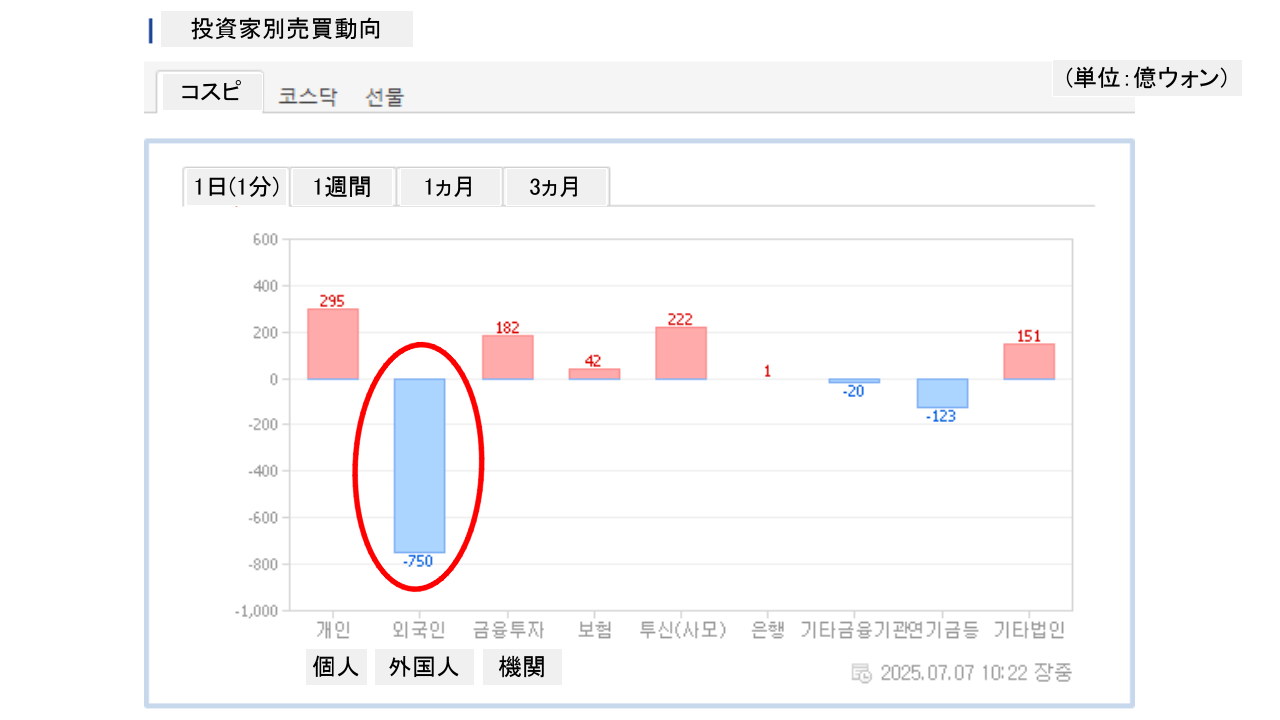 個人投資家は「235億ウォン」の買い越し。一方の外国人投資家は「750億ウォン」の売り越しです。