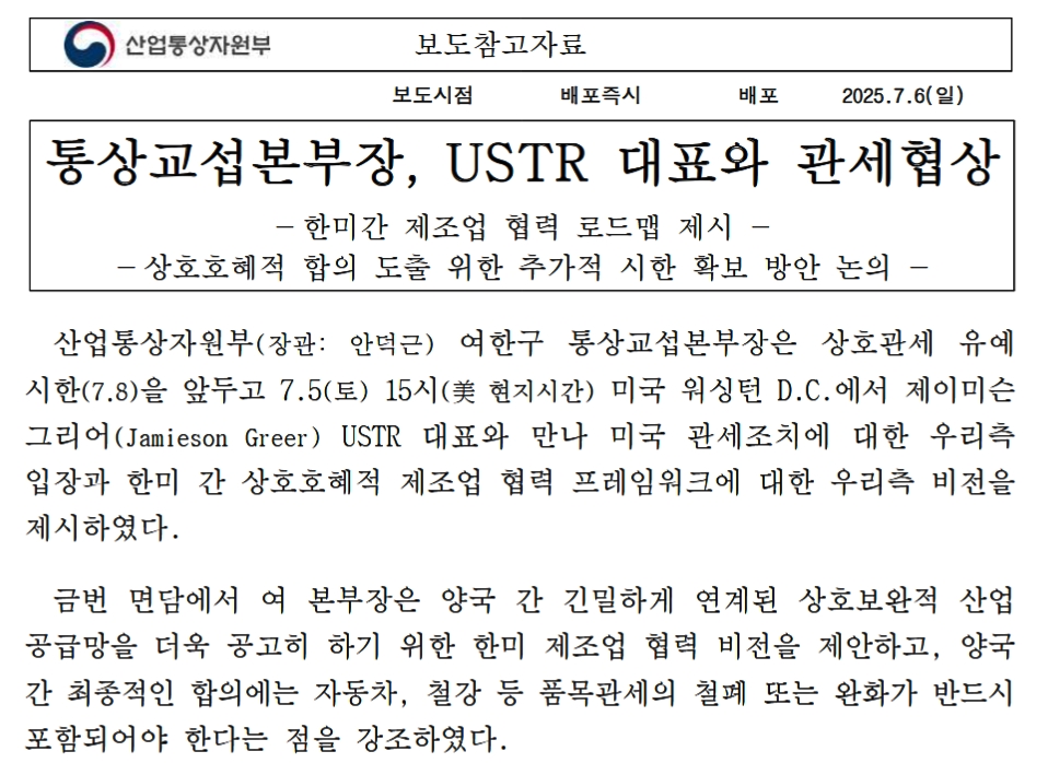 産業通商資源部(長官:安徳根(アン・ドックン))のヨ・ハング通商交渉本部長は、相互関税の猶予期限(7月8日)を前に、7月5日(土)15時(現地時間)にアメリカ合衆国・ワシントンD.C.でジェイミソン・グリア(Jamieson Greer)合衆国通商代表部(USTR)代表と会談し、米国の関税措置に対する韓国側の立場と、韓米間の相互互恵的な製造業協力の枠組みに対する韓国側のビジョンを提示した。