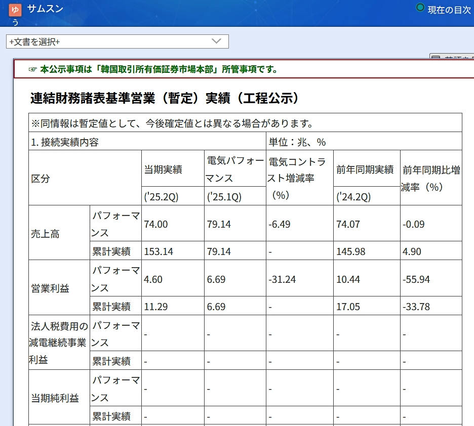 2025年07月08日、『サムスン電子』の2025年第2四半期の業績が暫定版ながら『DART』に公示されました。以下をご覧ください。