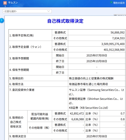 本日『サムスン電子』は自社株買いについて公示を出しています(以下)。