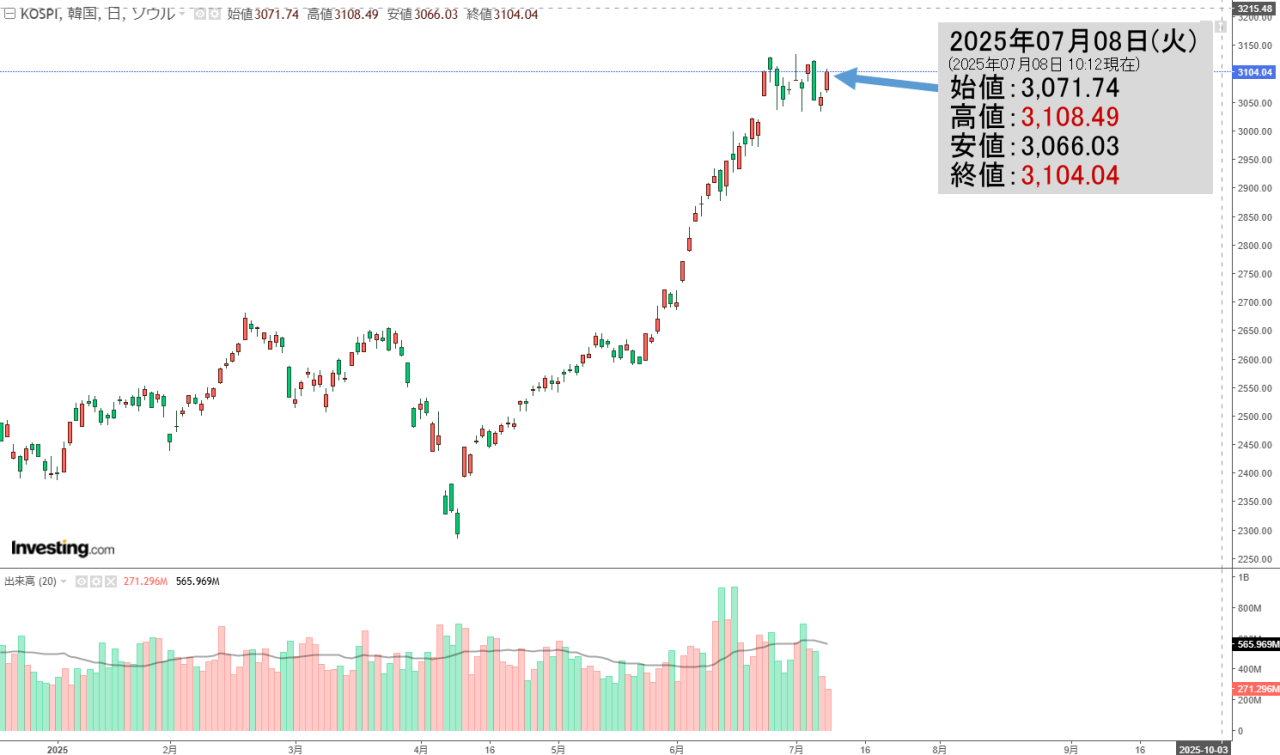 2025年07月08日(火)の韓国株式市場が締まりました。15:53現在、KOSPI(韓国総合株価指数)のチャートは以下のようになっています(チャートは『Investing.com』より引用)。陽線で締まりました。KOSPIは「3,114」...