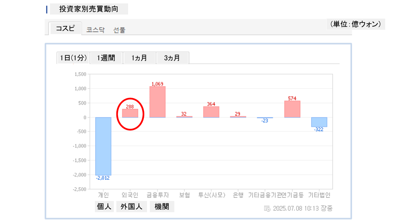 個人投資家は「2,012億ウォン」の売り越し。一方の外国人投資家は「288億ウォン」の買い越しです。