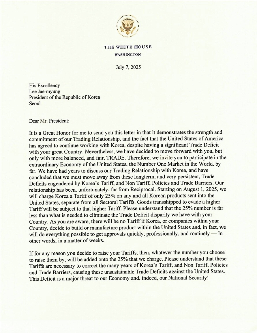 アメリカ合衆国・トランプ大統領から高関税についての書簡が各国に送られ、韓国は「25%」が提示されました。実際に関税賦課となるのは2025年08月01日からです。