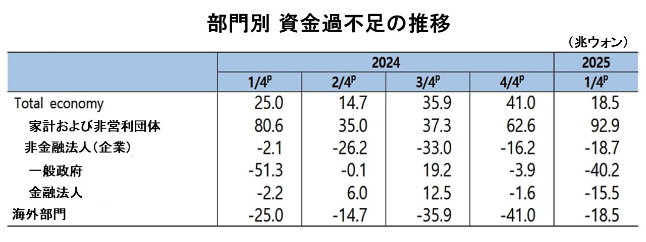 2025年第1四半期には政府と非金融法人の資金調達が拡大し、一方で家計部門の資金運用が大幅に増加したことが示されています。
