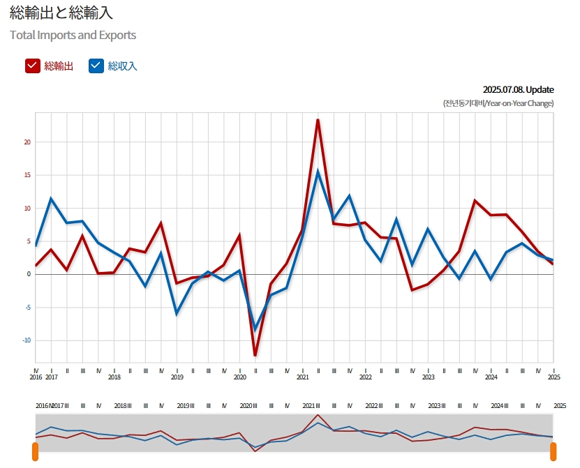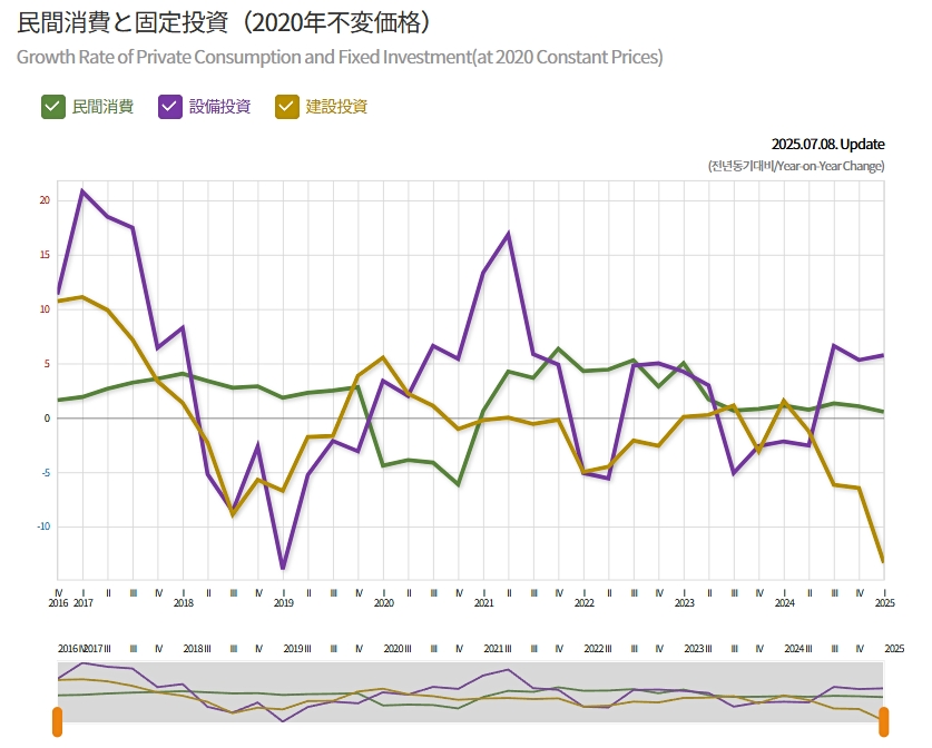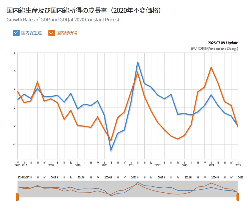 「国内総生産」「国内総所得」共に、2025年第1四半期には「0」成長に落ち込みました。