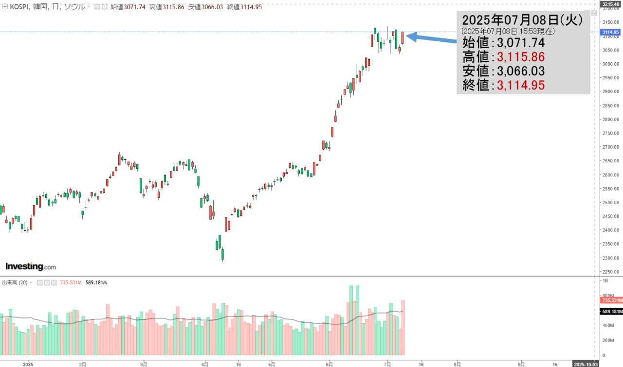 2025年07月08日(火)の韓国株式市場が締まりました。15:53現在、KOSPI(韓国総合株価指数)のチャートは以下のようになっています(チャートは『Investing.com』より引用)。
