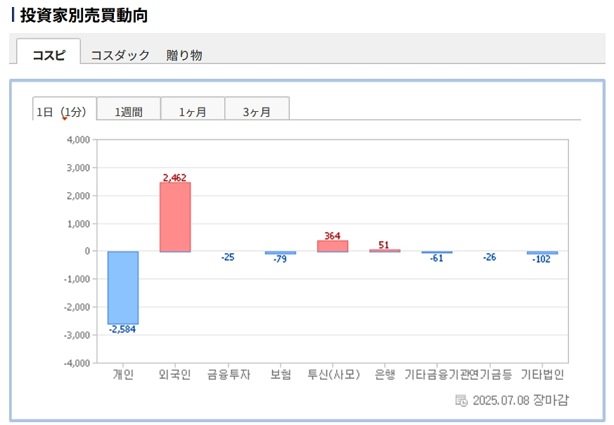 個人投資家は「2,584億ウォン」の売り越し。一方の外国人投資家は「2,462億ウォン」の買い越しです。