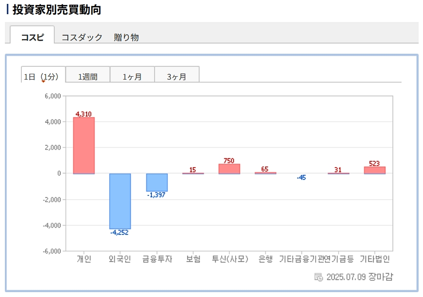 個人投資家は「4,310億ウォン」の買い越し。一方の外国人投資家は「4,252億ウォン」の売り越しです。
